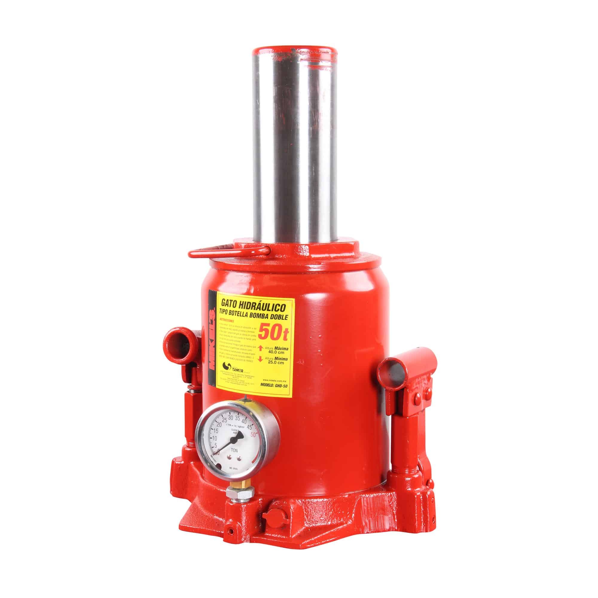 Gato de botella para uso extra pesado con una impresionante capacidad de levantamiento de 50 toneladas.